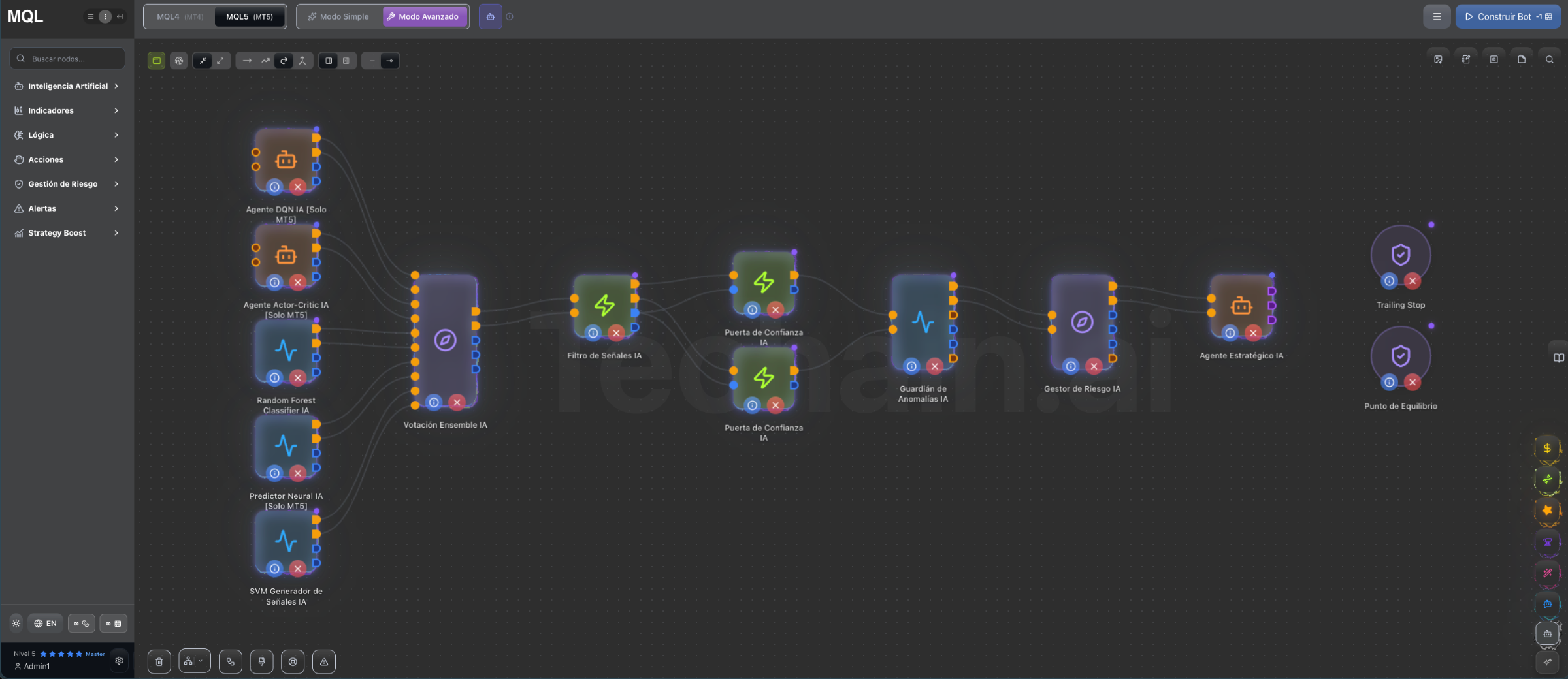 Nuestro motor de IA avanzado convierte tu estrategia visual en código MQL limpio y optimizado. El proceso toma segundos: defines tu lógica visual conectando nodos → IA genera el código → descargas tu EA listo para usar. Código fuente incluido para máxima transparencia. Tu EA es tuyo.